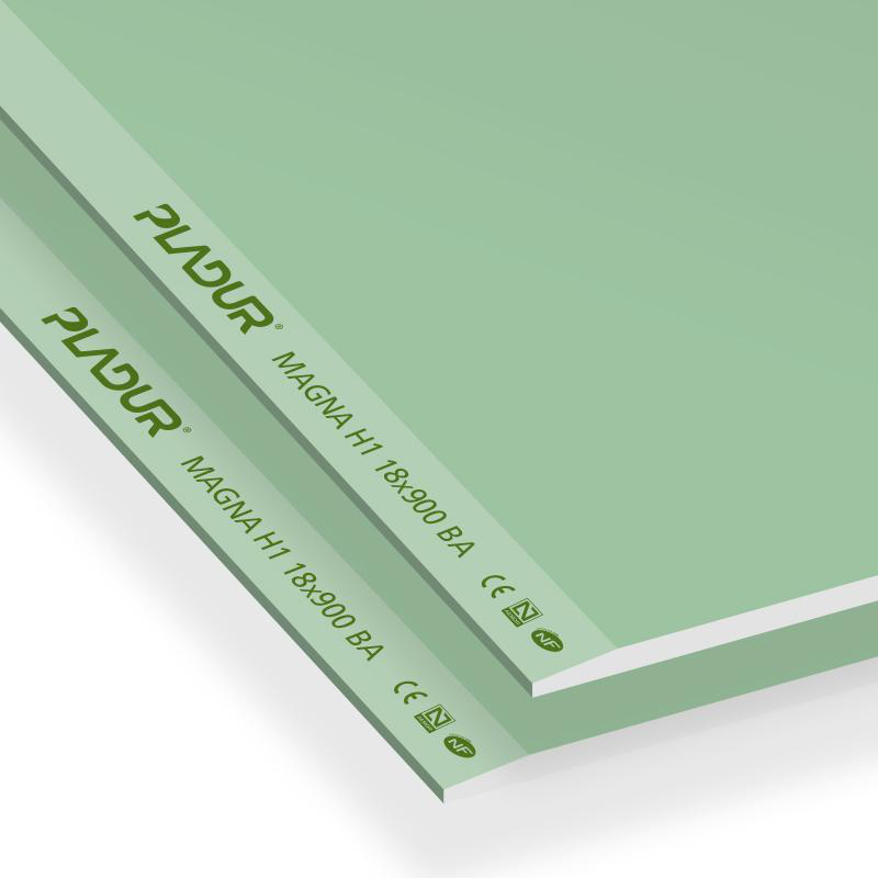 La plaque PLADUR ® MAGNA H1 est constituée d’un cœur en plâtre hydrofugé et de parements verts (face) et gris (dos). Elle présente une grande résistance aux chocs, au feu et au bruit.