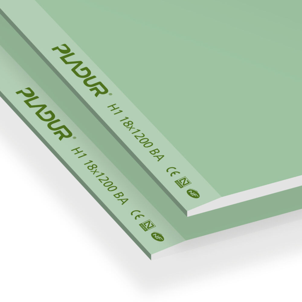 La plaque PLADUR ® H1 est constituée d’un cœur en plâtre hydrofugé et de parements verts (face) et gris (dos)