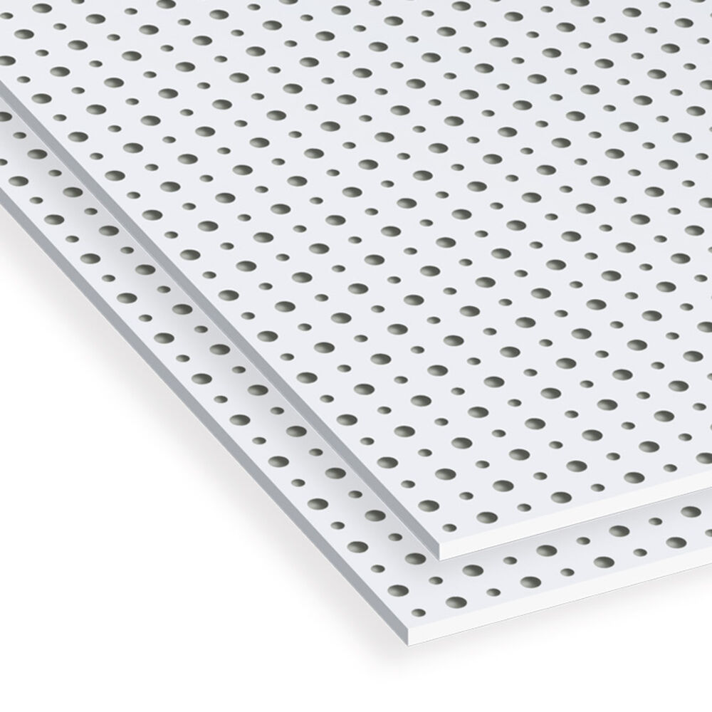 La gamme de plafonds non démontables PLADUR ® FON est com- posée de plaques spéciales tant dans leur formulation que dans leurs caractéristiques, de 13 mm d’épaisseur avec différentes perforations : rondes (R), carrées (C) ou longitudinales (L). Elles comprennent sur leur face arrière un voile en fibres de verre noir ou blanc qui améliore l’absorption acoustique, et crée une barrière contre la poussière et les particules. Les plaques PLADUR ® FON sont revêtues d’une fine couche de pein- ture blanche qui les protège des rayonnements ultraviolets