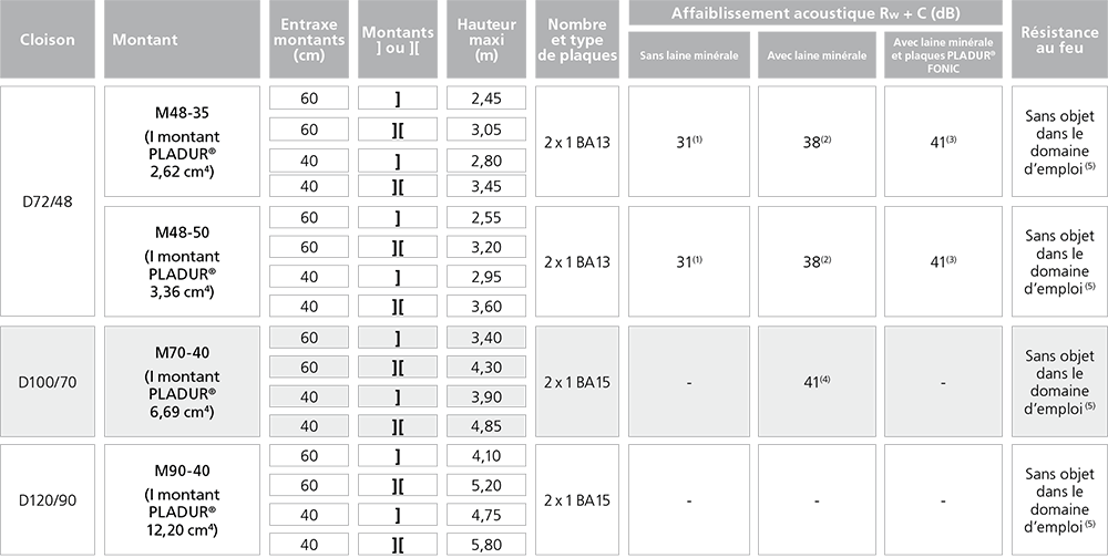 (5) : parements simples BA 13 ou BA 15 uniquement admis dans les parties privatives (NF DTU 25.41 P1-1 art. 5.2 et tableau 1), pour lesquelles, sauf exception, aucune résistance au feu n’est demandée