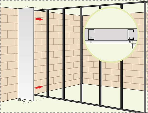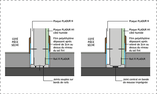Locaux humides : plaque PLADUR® H1 du côté du local humide + étanchéité sous le rail bas.