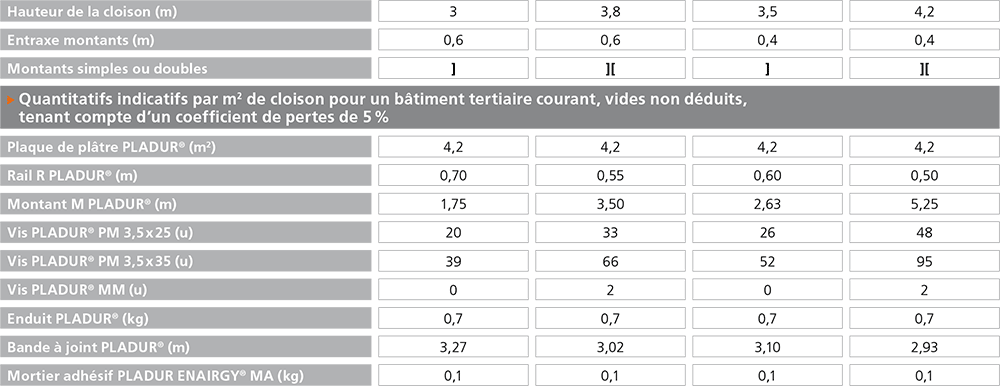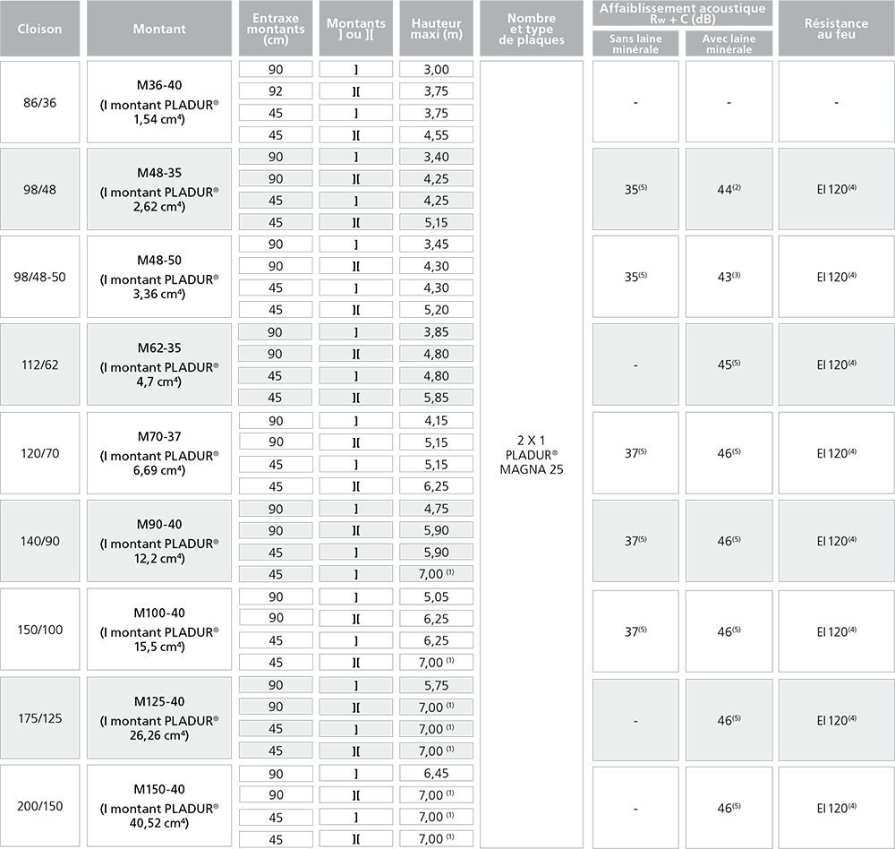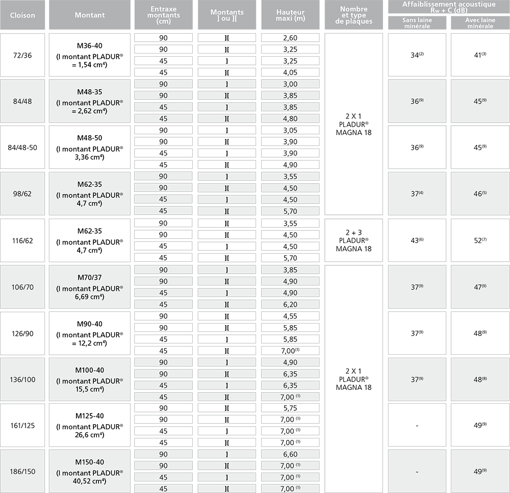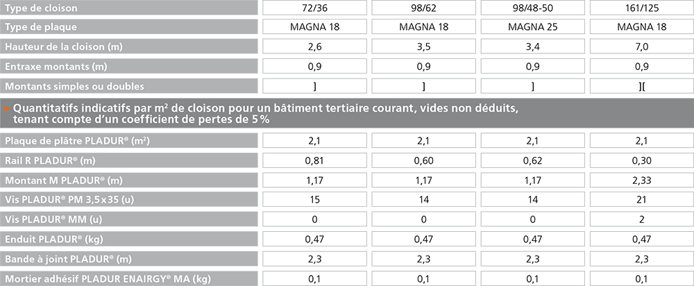 - Les plaques PLADUR® MAGNA 18 et MAGNA 25, de 900 mm de largeur, sont de haute dureté (type I selon la norme EN 520). Elles conviennent donc aux zones particulièrement exposées aux chocs. - Choisir l’ossature en fonction de la hauteur entre étages et du parement à mettre en oeuvre :
