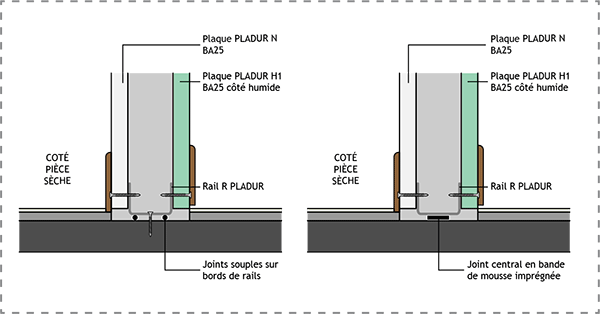Locaux humides : plaque PLADUR® H1 du côté du local humide + étanchéité sous le rail bas.