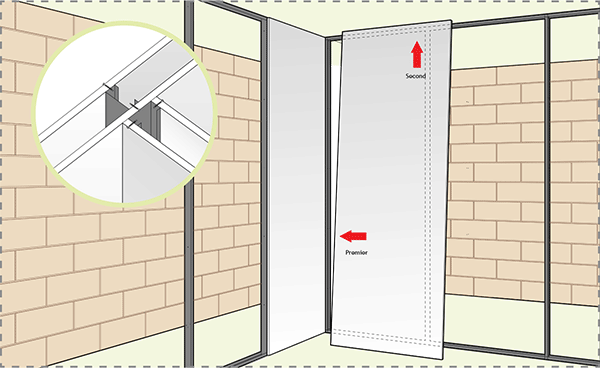 - Poser la première demi-plaque bord coupé coté mur puis les autres plaques de première peau en décalant les joints d’un parement à l’autre.