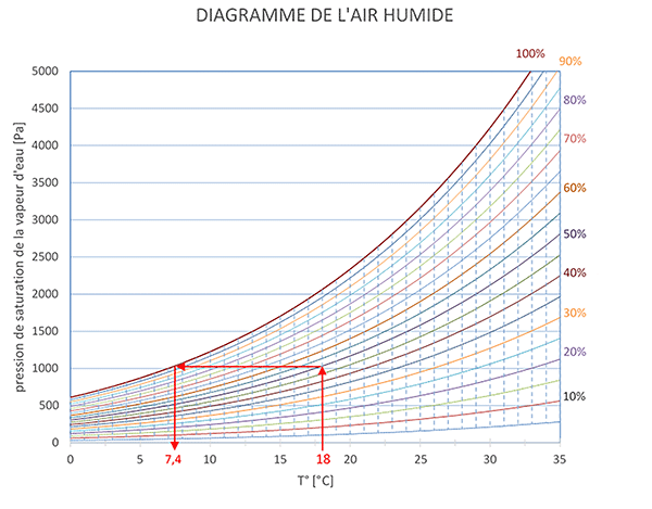 Dans l’exemple qui suit, un air à 18°C et 50 % H.R. rencontrerait sa température de condensation à 7,4°C environ : les matériaux isolants situés à l’intérieur de la construction ne doivent donc pas être exposés à cette température où, si leur exposition est inévitable, doivent être protégés de la vapeur d’eau, par exemple en disposant côté chaud un pare-vapeur efficace.