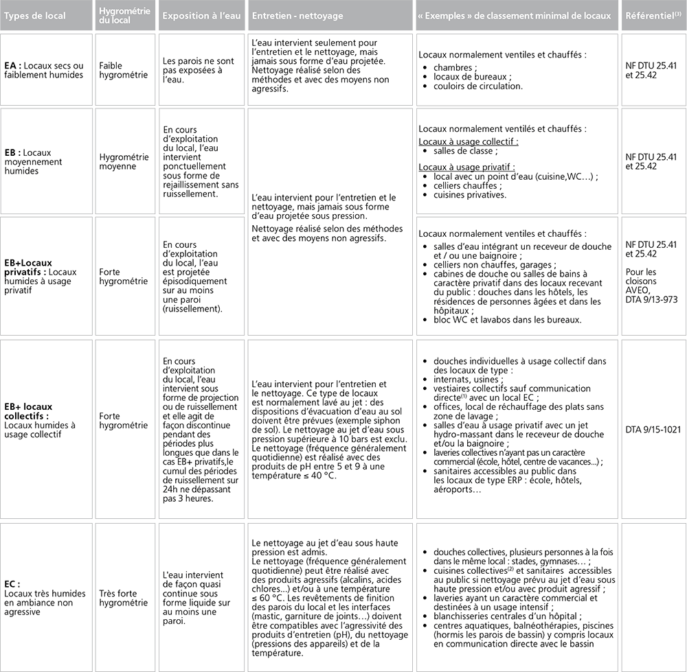 Le tableau qui suit, issu du NF DTU 58.1 et repris de la norme NF EN 13964, indique le classement des locaux en fonction de leurs ambiances hygrothermiques.