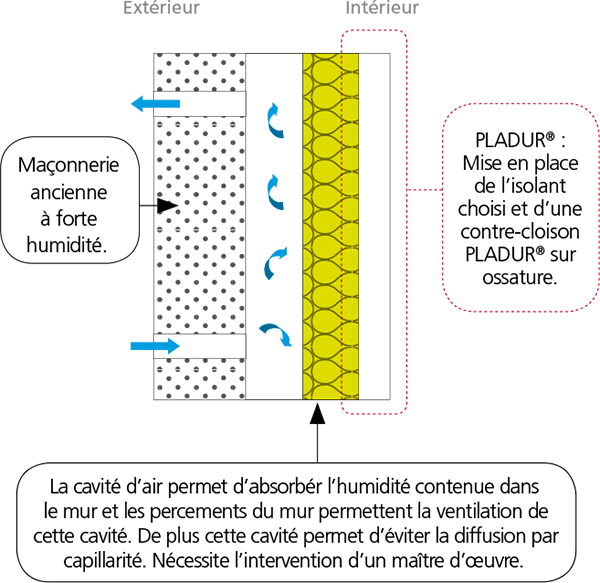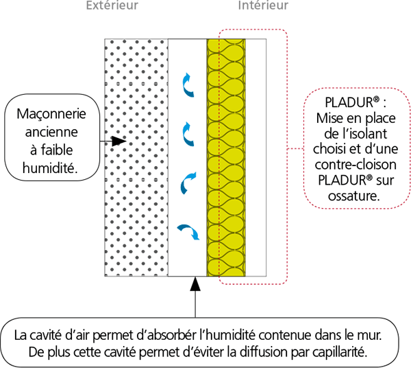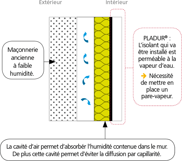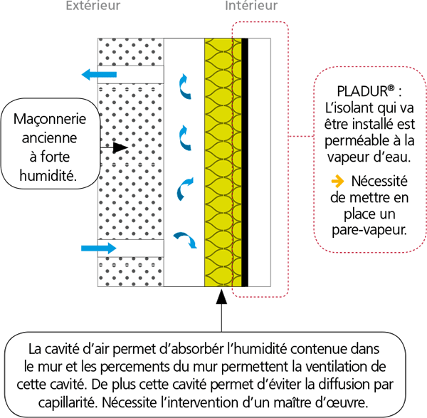 L’isolant peut être en contact avec le mur extérieur et les lames d’air ne sont pas toujours ventilées, les condensations sur le parement intérieur du mur extérieur étant presque toujours inévitables. La démarche générale consistera donc à réduire ce risque.
