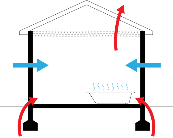 Elle provient de sources diverses et s’évacue essentiellement par le chauffage et la ventilation : le chauffage augmente la température de l’air et par conséquent sa capacité à absorber l’humidité, la ventilation renouvelle l’air et donc évacue l’air chargé en humidité et le remplace par de l’air neuf.
